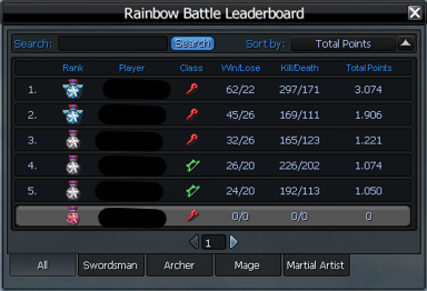 At the bottom there are 4 tabs : All, Swordsman, Archer and Mage. By default the leaderboard shows players of all classes, however you can choose to only show players of a certain class by clicking on a tab.