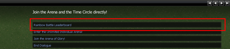The leaderboard for the ranked rainbow battle can be accessed from the Time Circle dialog, by talking to Titus Trip in Nosville or Litatiz in Olorun Village.